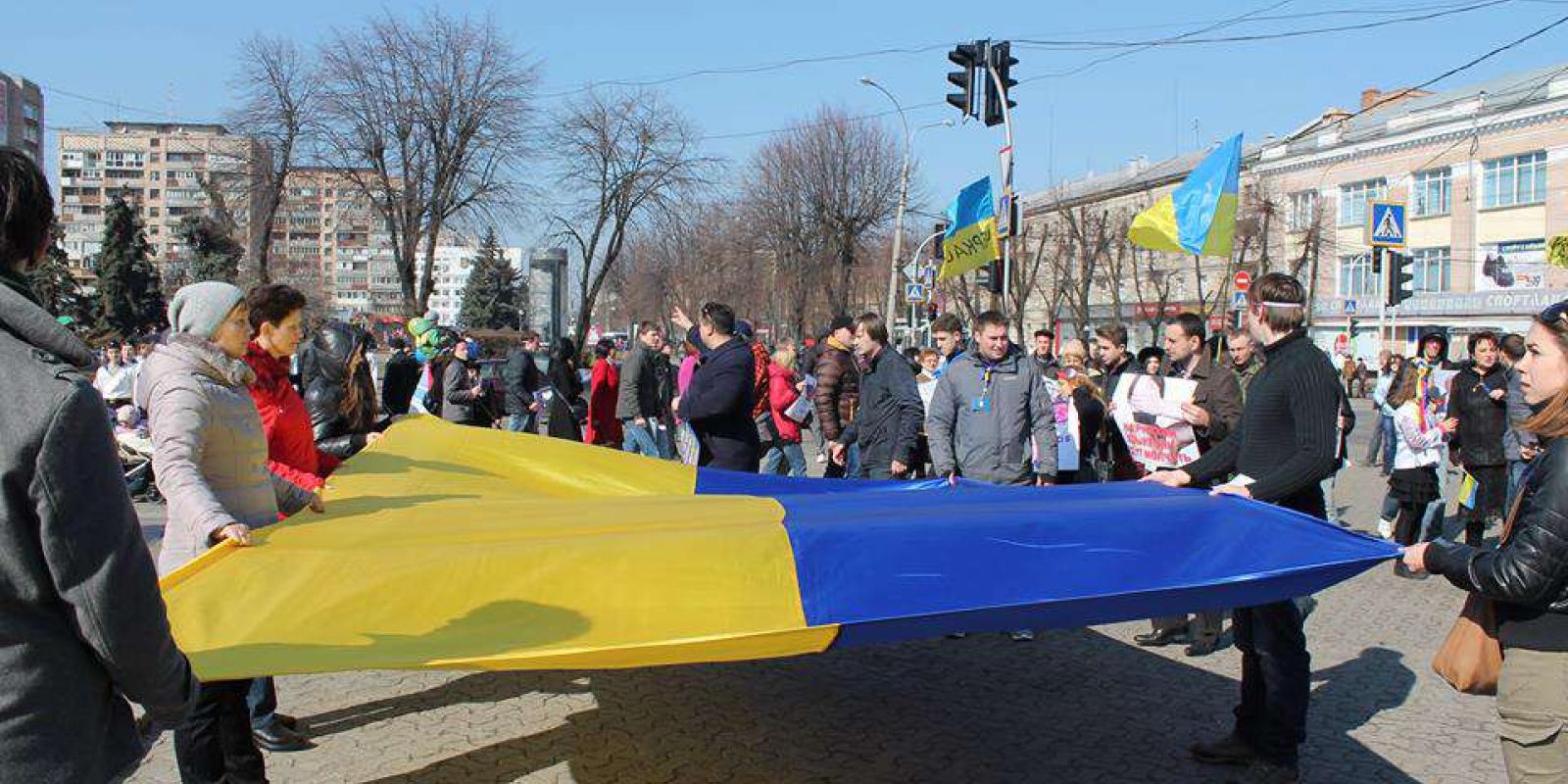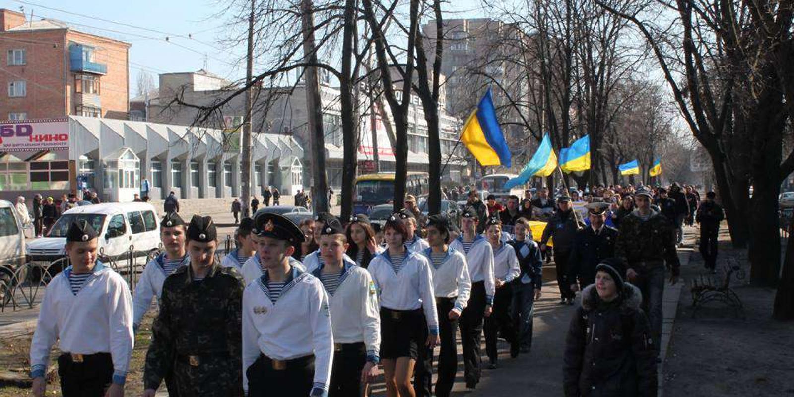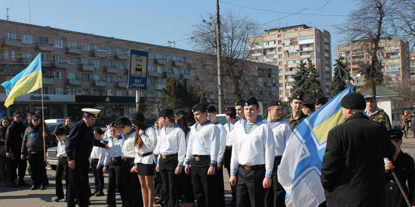 Під час акції на ґанку мерії активісти висловили щиру підтримку українським військовим у Криму, які проявляють неймовірну витримку та мужність і залишаються вірними присязі, даній народу України, відмовляються здавати зброю на ставати на бік ворога.