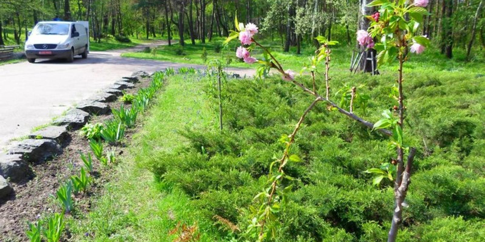 – Не лише японська декоративна вишня з’явилася у парку, – зазначає Наталя Матюша, фахівець із ландшафтного дизайну. – Висаджуємо три види кущів спіреї, близько десяти різних видів ялівцю, бузок, форзицію, а також ясколку.