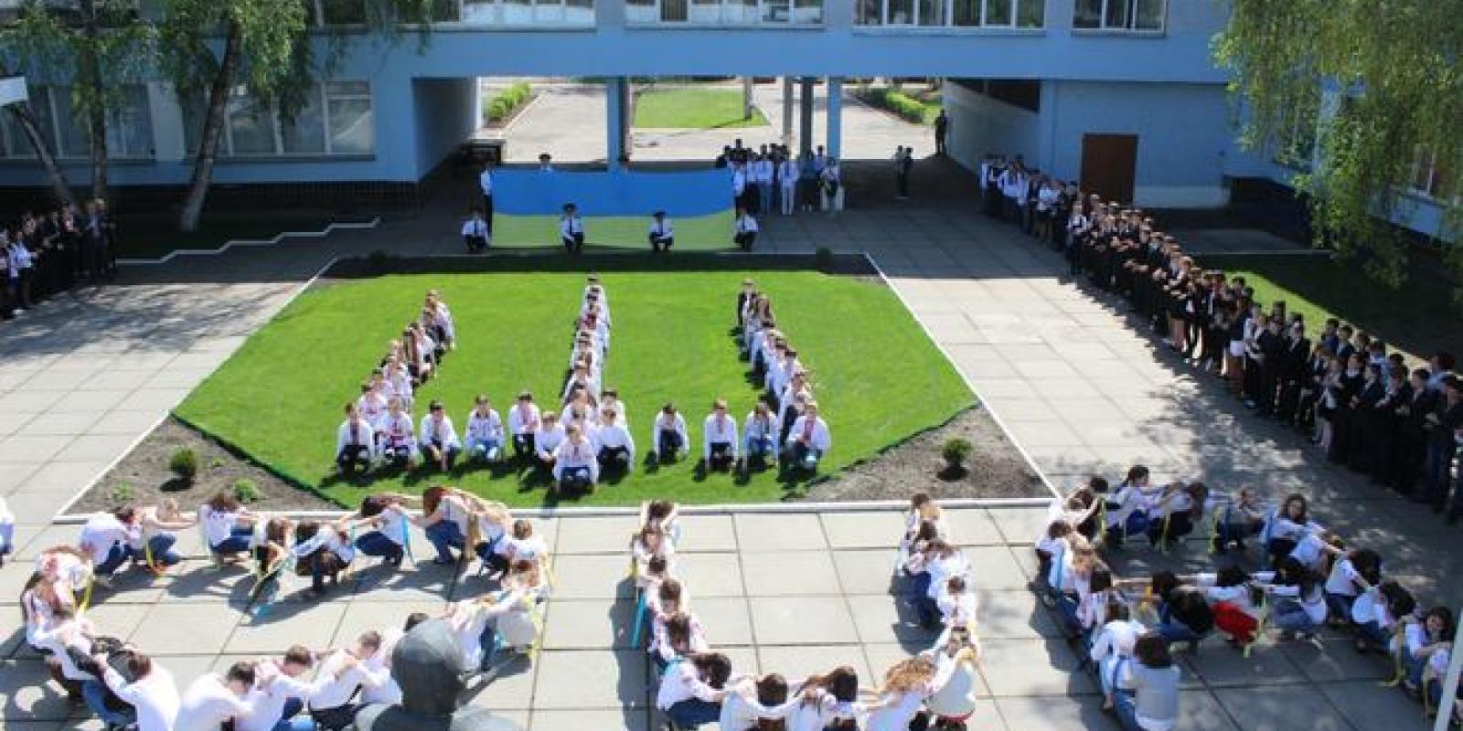 Спочатку вони своїми тілами створили тризуб, а потім освідчились Україні в коханні. Фразу "Я люблю UA" утворили майже сотня учнів. А далі вони винесли на шкільне подвір’я прапор, довжиною аж у 6 метрів.