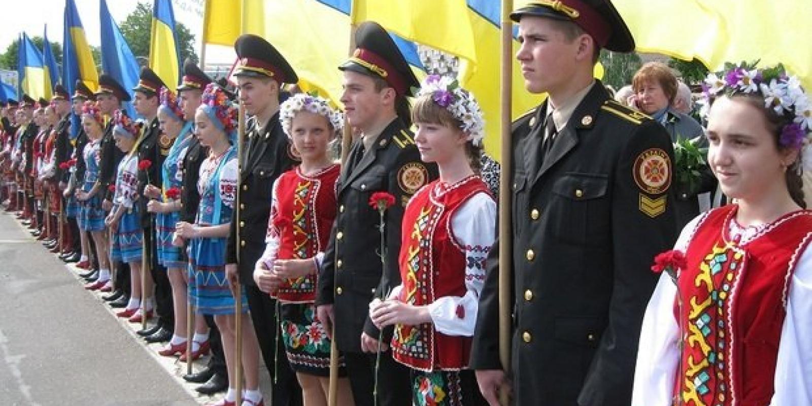 Ветерани сидять біля сцени на стільцях. Навпроти сцени стоять хлопці у формі та одягнені в українські костюми дівчата.