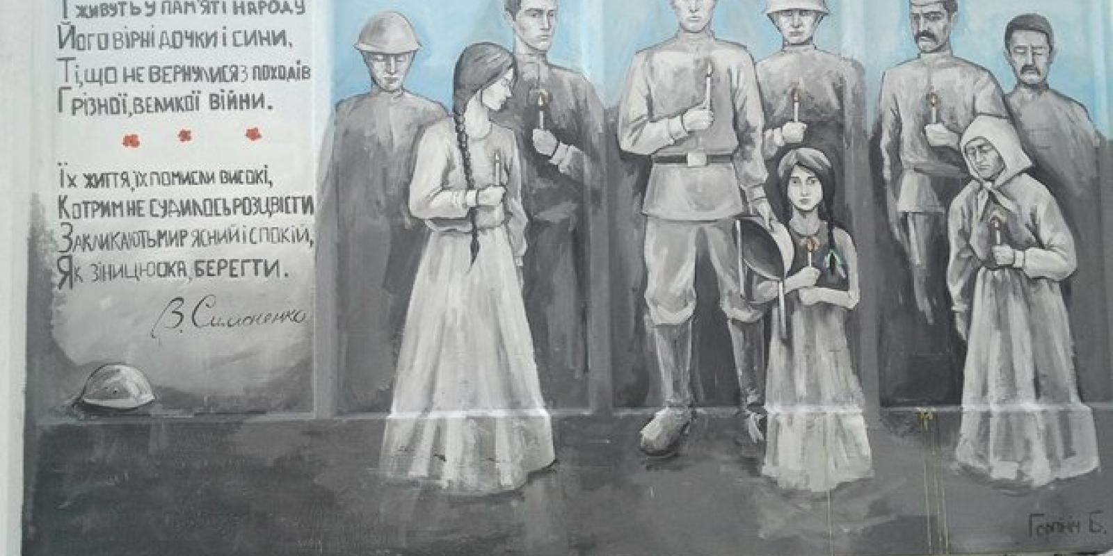 На стіні в середмісті – чорно-білі постаті загиблих солдатів, їхніх удів і дітей-сиріт. Поряд із людськими фігурами – слова із вірша Василя Симоненка про війну.