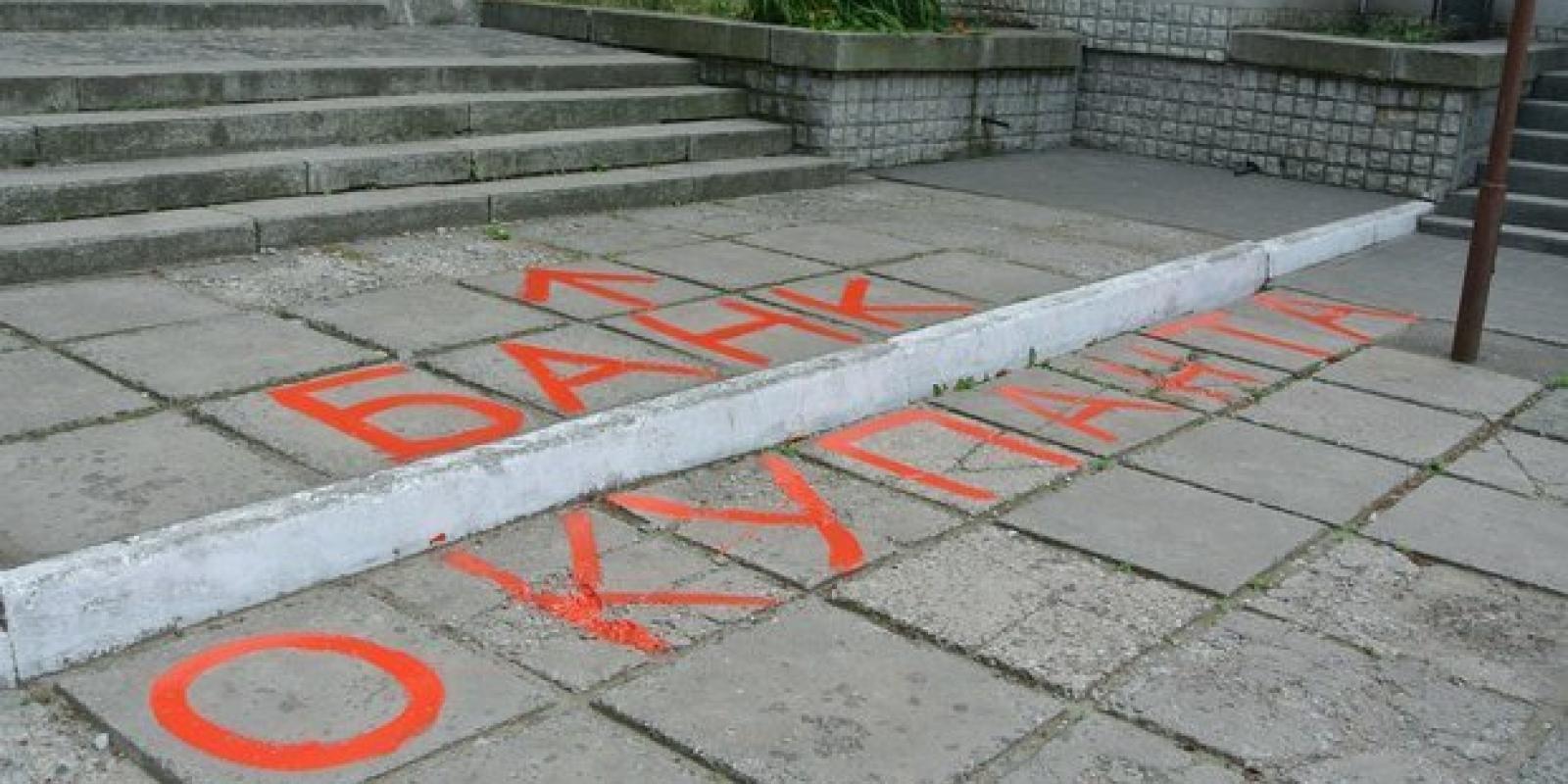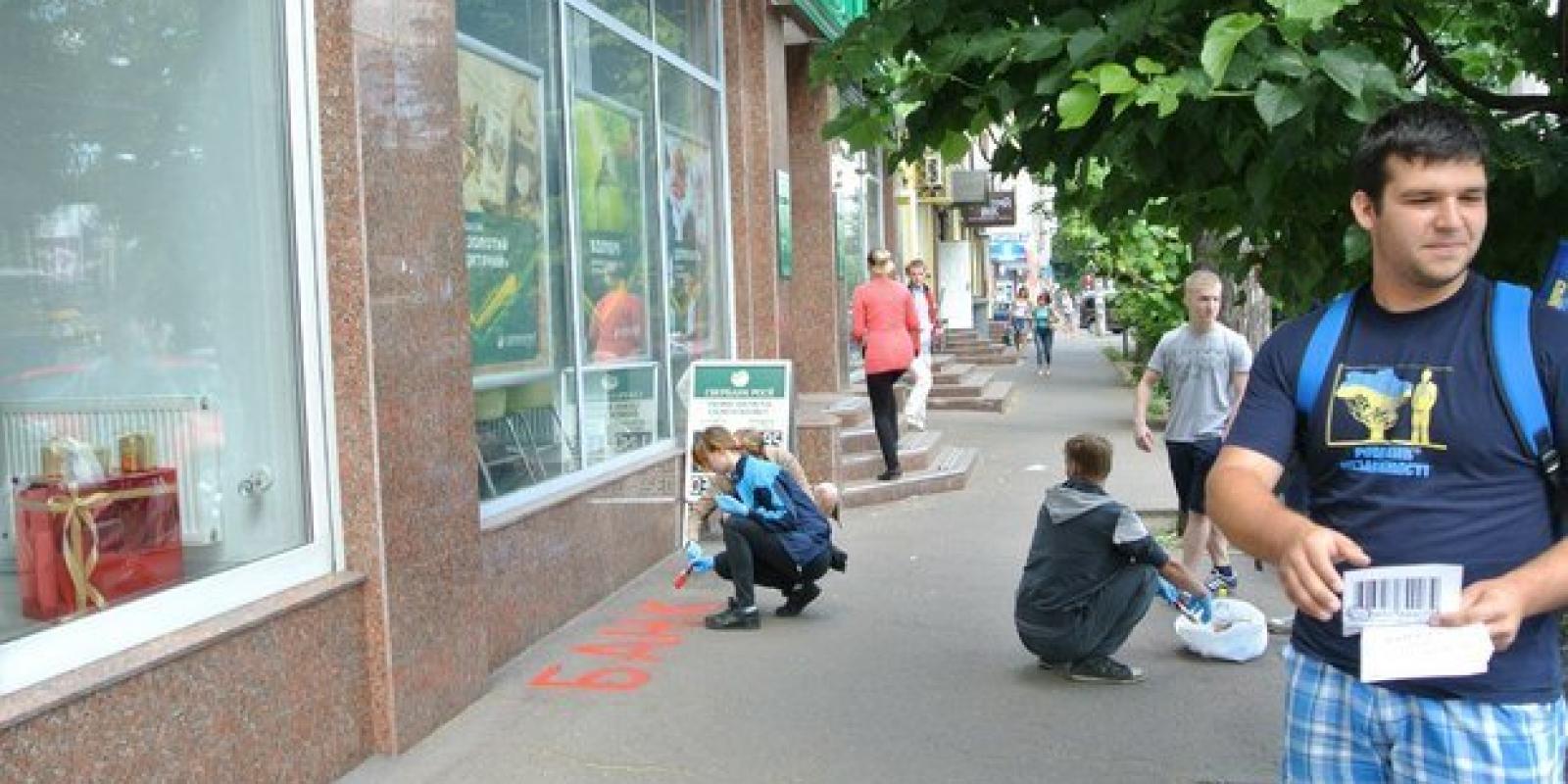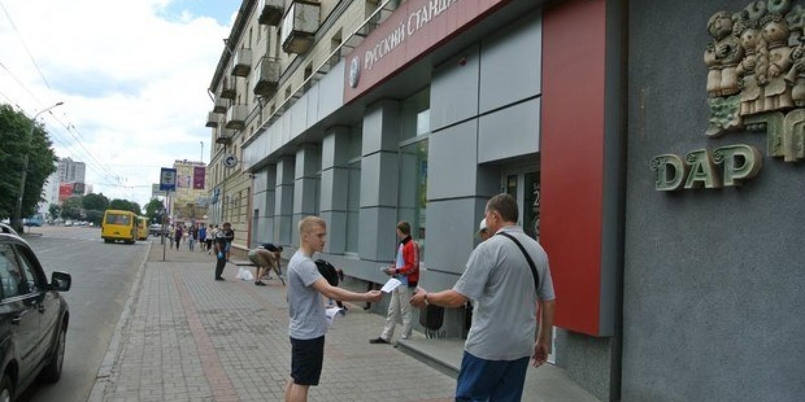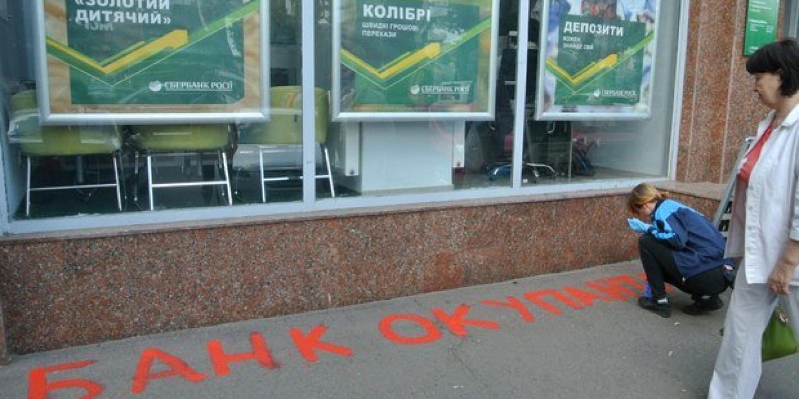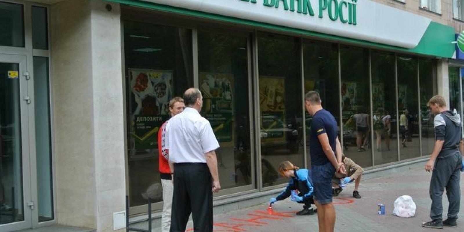 Під приціл націоналістів потрапили російські "ВТБ", "Сбербанк Росії" та "Русский Стандарт". Молодь в рамках акції "Бойкотуй російські товари" роздала листівки зі закликом: "Не фінансуй банки окупантів!" та патріотичними гаслами рідиною червоного кольору розписали асфальт перед установами, які сприяють діяльності терористів у нашій державі. Це символізувало кров, що вже пролилася на сході нашої держави за прямого військового й фінансового сприяння Кремля.