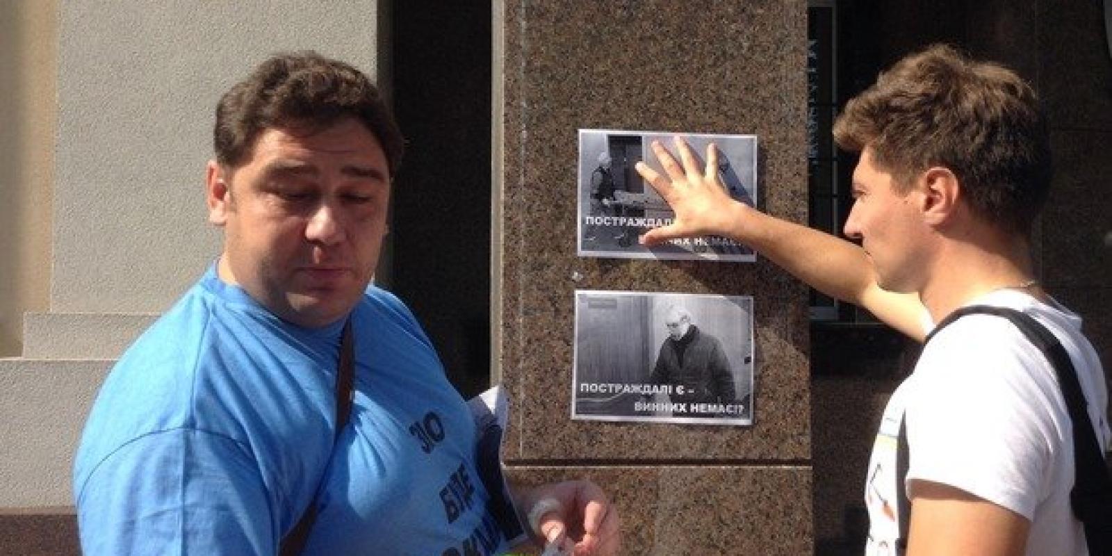 Мітингувальники обклеїли приміщення прокуратури фотографіями силовиків з написом "Постраждалі є – винних немає?".