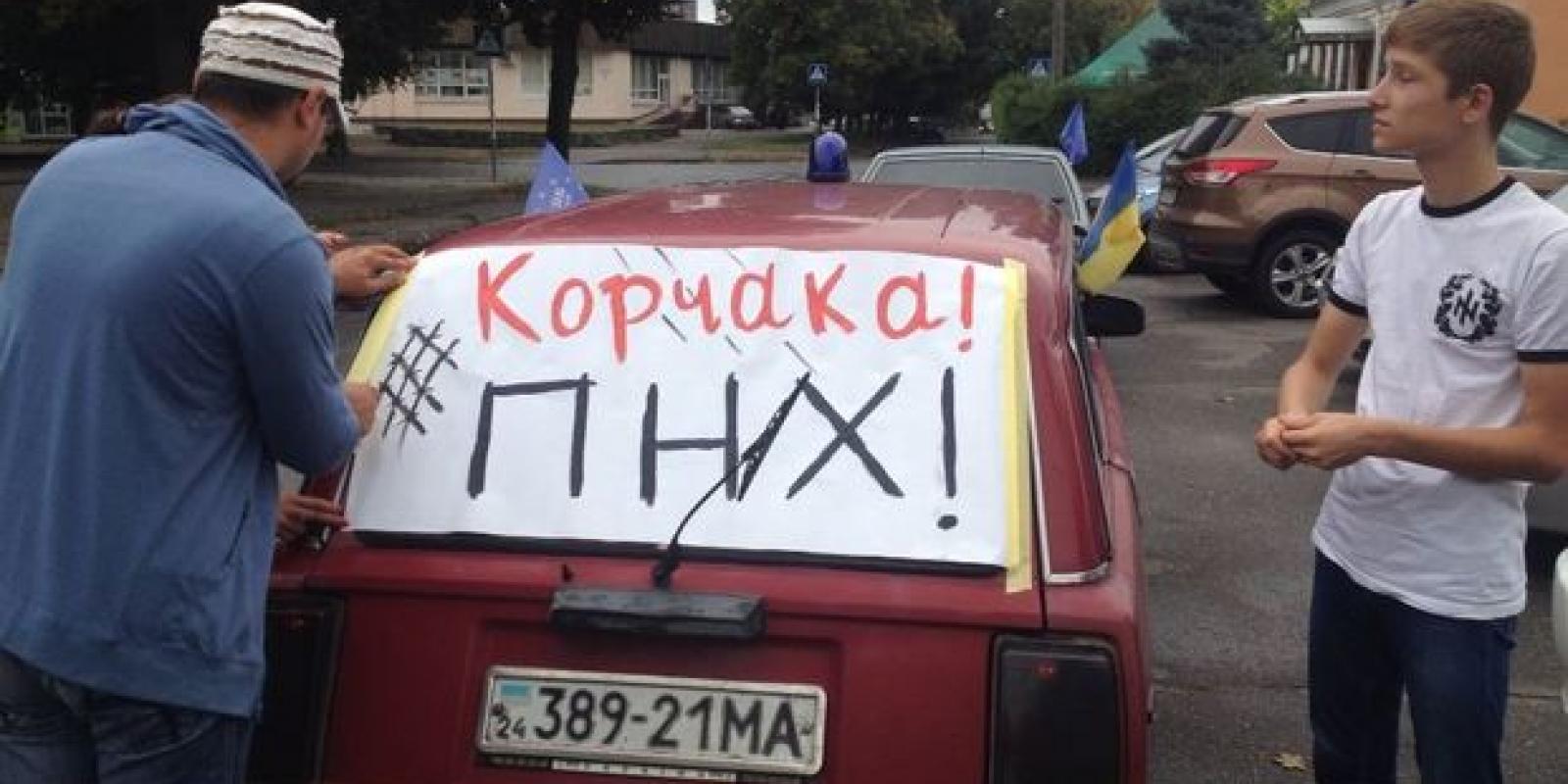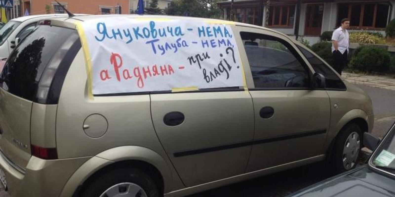 Протестувальники на своїх автівках з прапорами Черкас та України зробили три кола навколо будівлі обласної державної адміністрації, а потім вишикувались перед ОДА. ВОни тримають у руках плакати: “Корчака – ПНХ!”, “Пане Коваль, доведіть, що ви з Майданом”, “Януковича – нема, Тулуба – нема, а Радняна – при владі?”, “Негайна люстрація, війна не привід відтягувати люстрацію”.