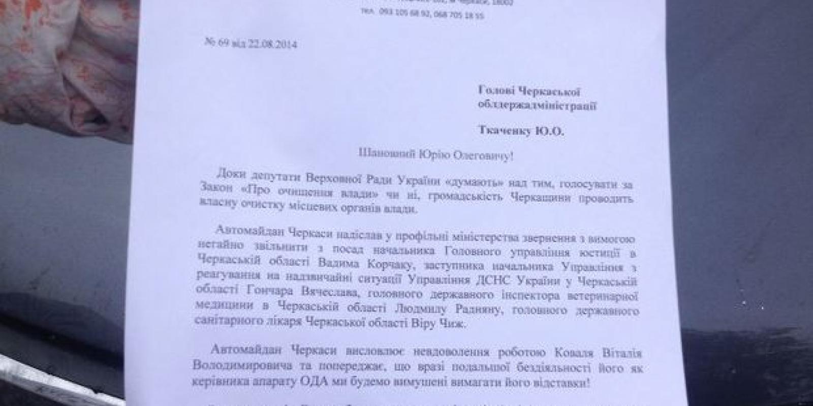 Сьогодні, 22 серпня, представники черкаського Автомайдану разом з Люстраційним комітетом, КВУ та ГО “ОПОРА” організували акцію протесту проти ряду посадовців, які працювали проти народу за часів Януковича, і які досі залишаються на своїх посадах.