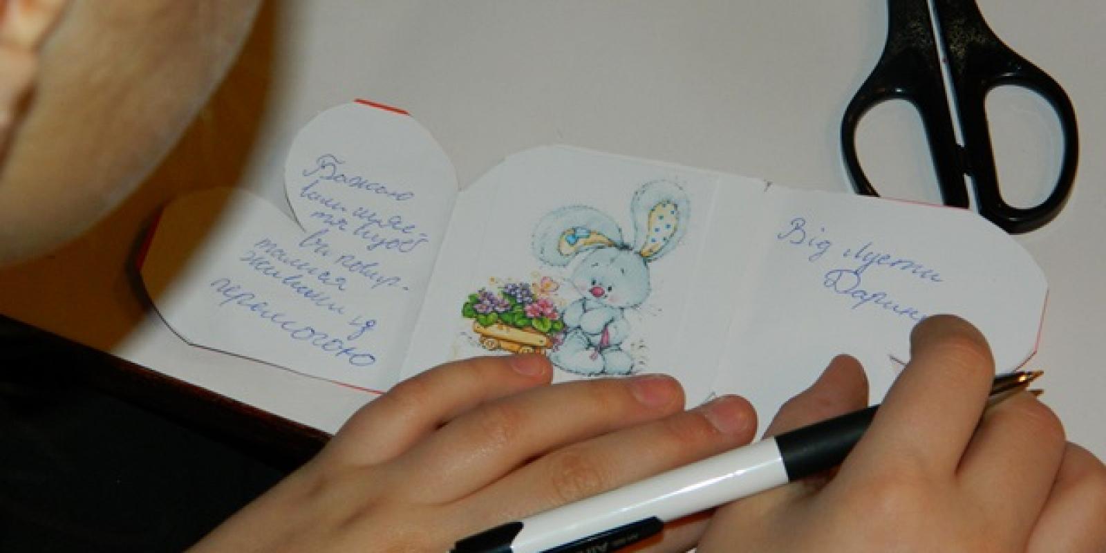 Учениця 3-го класу Ліза Культя старанно вирізає сердечко із рожевого паперу. До нього клеїть всміхненого зайчика, а потім ще й пише власне побажання для бійця, якому воно потрапить до рук.