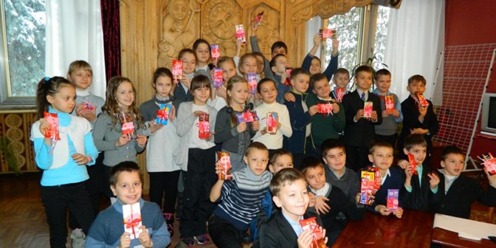 Поруч з Лізою 9-річний Данилко старанно виводить побажання «Щастя, здоров’я, сил. Бажаю повернутися живим. Слава Україні!». Листівку прикріпляє до шоколадки.