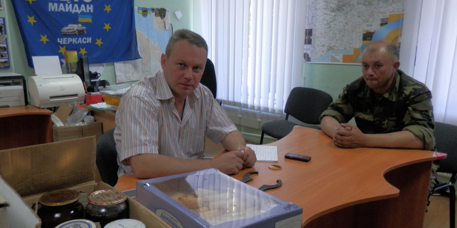 - Сьогодні нам передають продукти, дві холодильні установки, які забезпечив один із черкаських підприємців, та інструменти, які забезпечив «Автомайдан» - для обслуговування нашої техніки. У Смілі із лісопилки забираємо дошки для спорудження бліндажів, бо палатки – це найперший орієнтир для мінометного вогню ворога, - пояснює Анатолій Стуженко. – Двадцять кубів деревини для бліндажів і нар з’явилися завдяки благодійному фонду «З вірою в себе», яким керує волонтер «Автомайдану» Альона Вербицька. Її фонд, спільно із черкаським «Водоканалом», забезпечив наших бійців 5 тоннами очищеної артезіанської води. Цю воду ми дуже бережемо - бо у АТО, у так званих «районах очікування», доводиться по 5-7 діб виживати на тих припасах, що були із собою – доставки не буде, аби не виказати район перебування. Тому солодку продукцію ми одразу роздаємо людям, а консервацію і все те, що одразу не псується, зберігаємо на майбутнє.