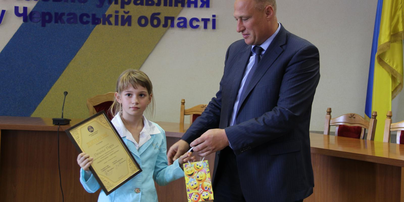 Начальник Головного управління ДФС у Черкаській області, голова журі регіонального конкурсу Володимир Коломієць нагородив дітей грамотами та цінними подарунками.