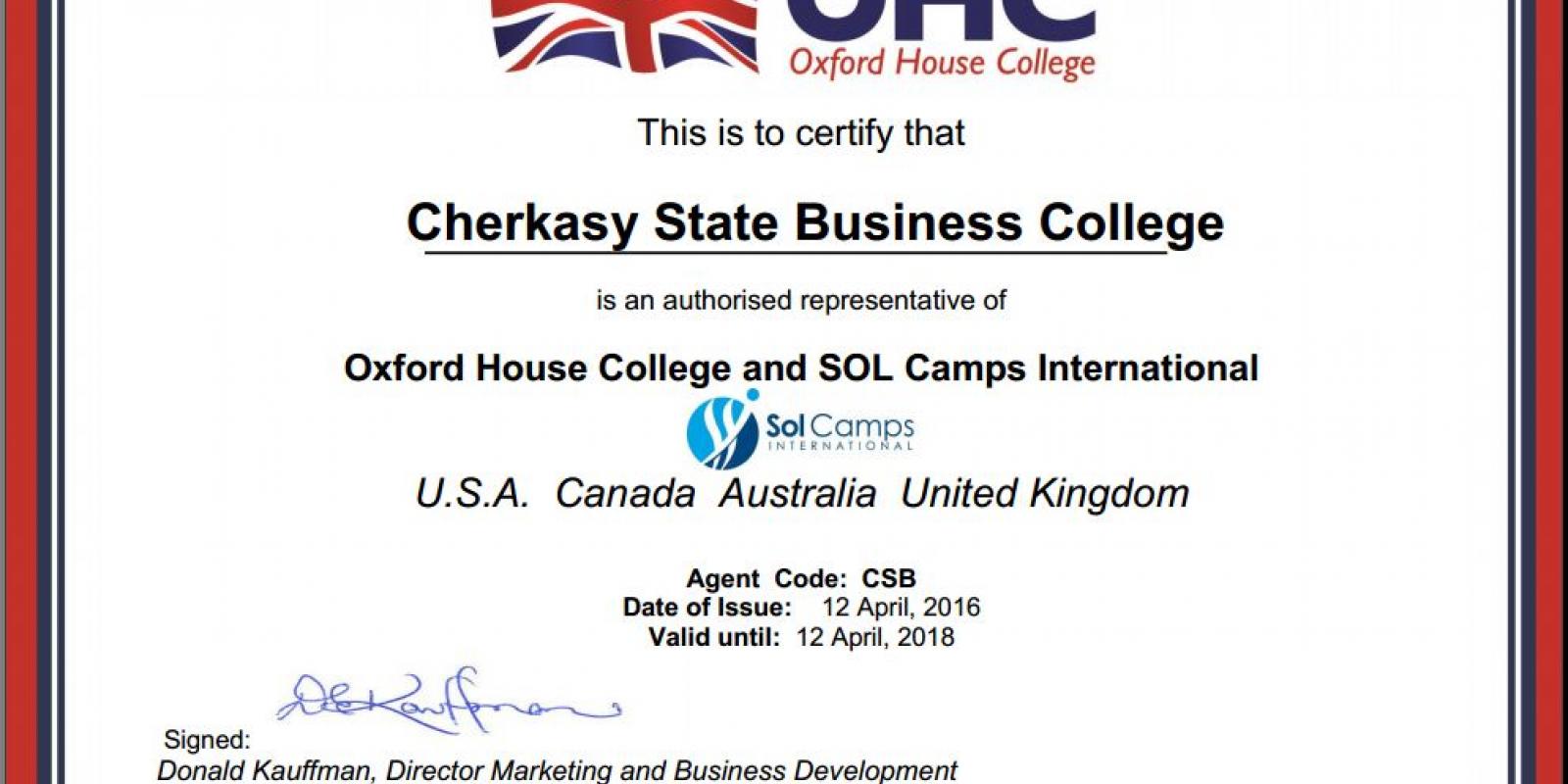 Відповідну угоду про співпрацю Oxford House College and SOL Camps International підписав із Черкаським державним бізнес-коледжем.