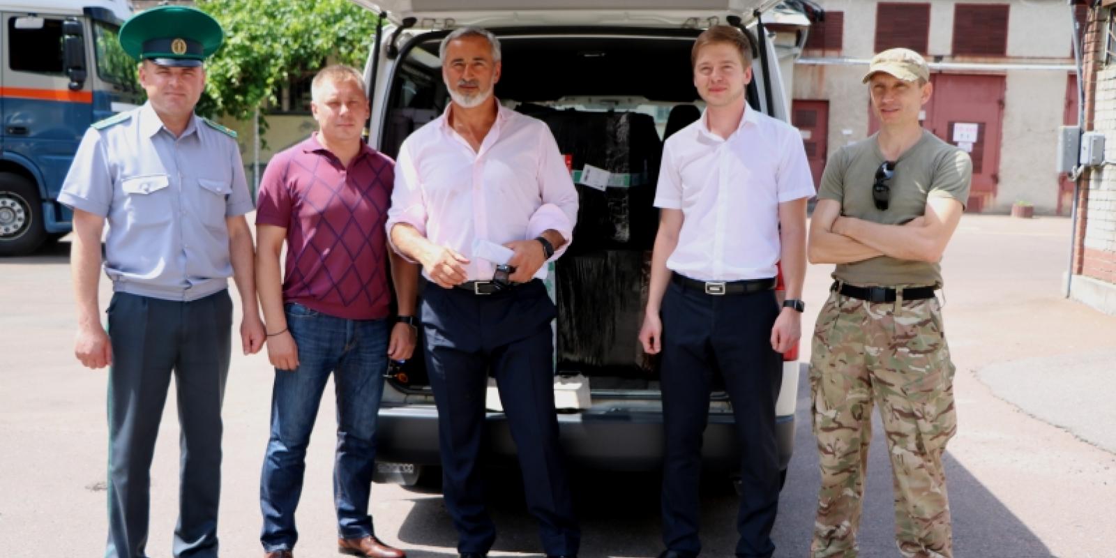 На фото: начальник медико-санітарної частини навчального центру підготовки молодших спеціалістів Державної прикордонної служби України майор Юрій Петруник та учасники групи «Патріот» (Станіслав Лукирич, Микола Мирза, Костянтин Чернецький, Олег Котенко) біля авто із переданою допомогою.