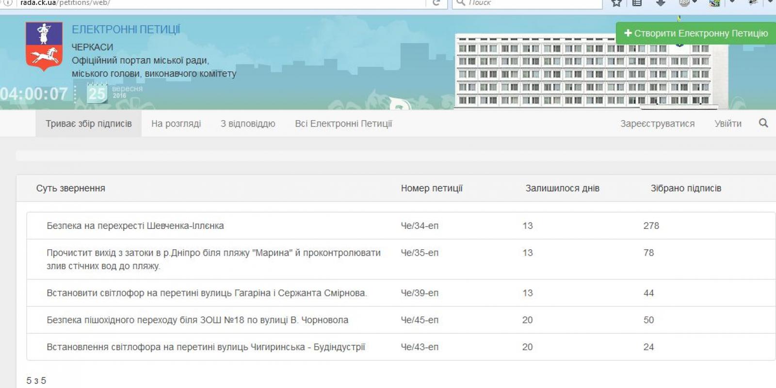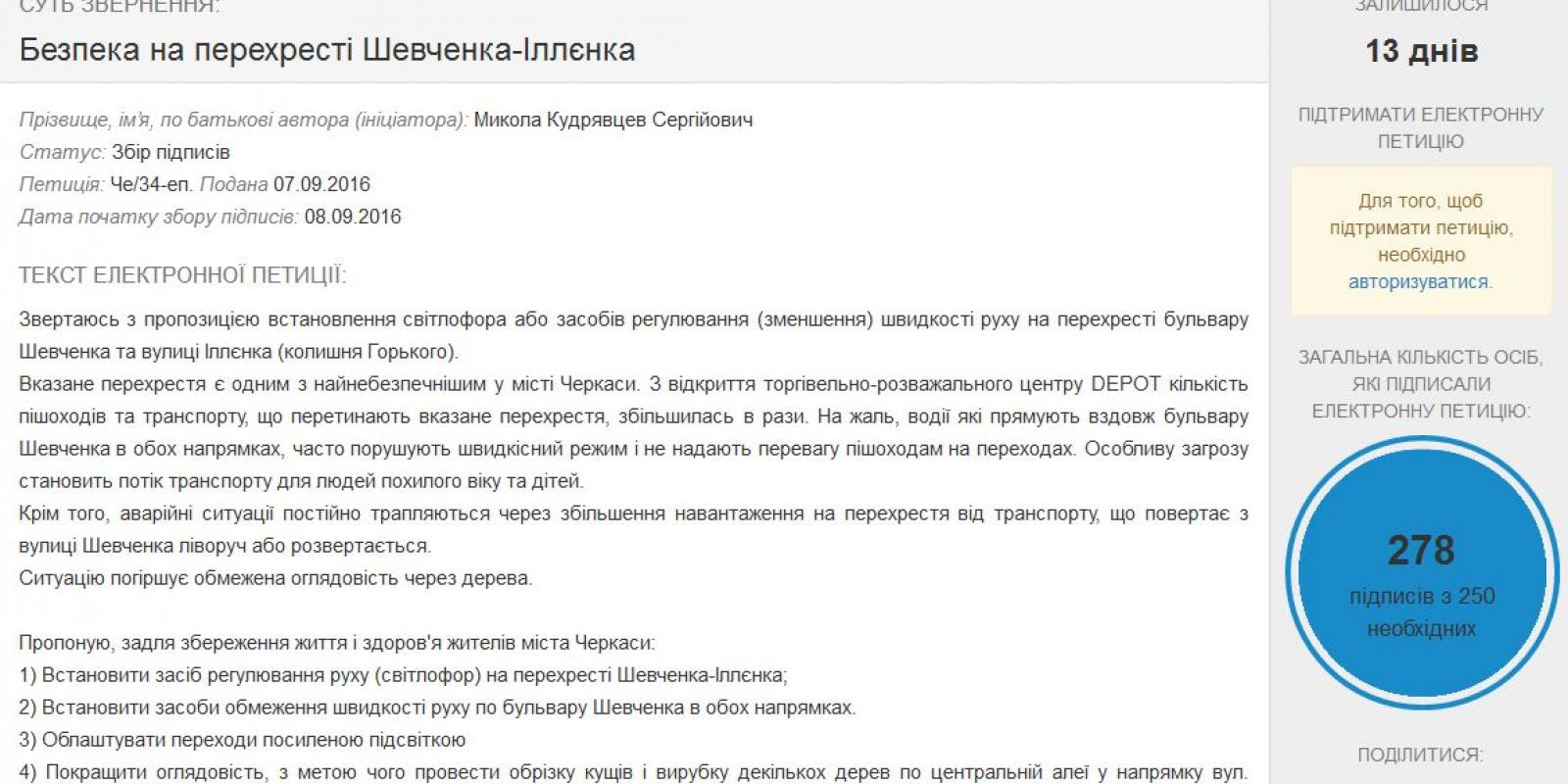 У Черкасах набрала 250 голосів, необхідних для розгляду, петиція, першою зареєстрована на сайті Черкаської міської ради. Нагадаємо: за впровадження механізму подачі черкащанами електронних петицій міська рада проголосувала наприкінці січня цього року, відповідний механізм на сайті міської ради було впроваджено на початку вересня (http://rada.ck.ua/petitions/web/34).