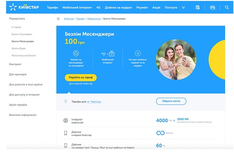 Щодо інших операторів, то обирати можна вже серед не таких вигідних, але теж непоганих пропозицій. Наприклад “Київстар” пропонує новий пакет “Безлім Месенджери”, він здорожчав з 75 до 100 грн на місяць, але й інтернету дає більше – тепер 4 гігабайти, а ще нам також пропонують безлімітне спілкування в месенджерах та соціальних мережах, безлімітні дзвінки в мережі “Київстар” та 60 хвилин дзвінків на номери інших операторів мобільного зв’язку в Україні або в Росію, Італію та Польщу. Тут вже доведеться пильнувати, щоб не зателефонувати закордон, коли вже виговорили ці 60 хвилин на українські мобільні номери.