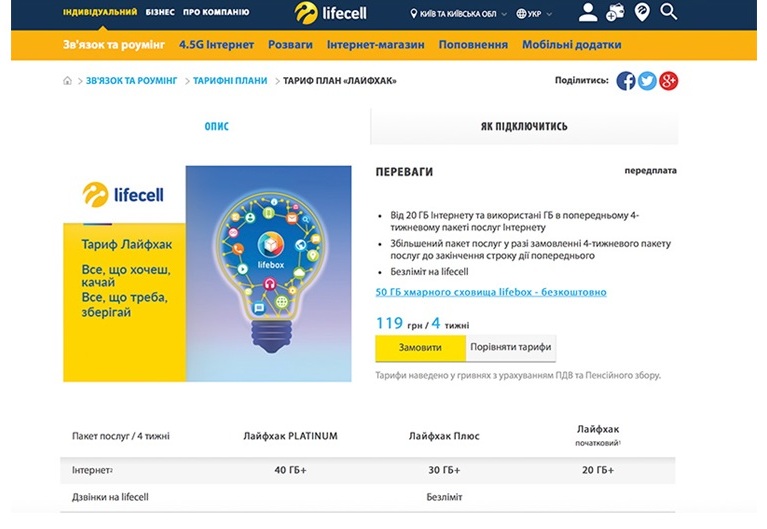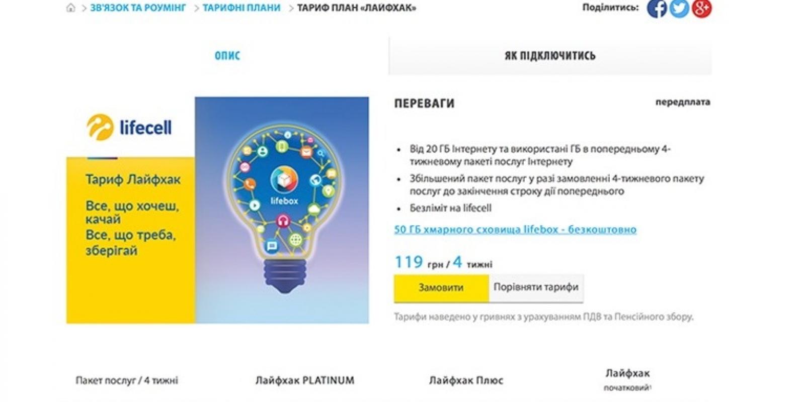 Lifecell, з огляду на нещодавній скандал зі списання коштів за незамовлені послуги, взагалі важко рекомендувати як найвигідніший варіант, тим більше, що сам оператор на сайті розміщує інформацію досить заплутано й остаточну вартість послуг за місяць підрахувати складно. Але якщо є бажання отримати ще більше інтернету за більші кошти, то оператор пропонує тариф «Лайфхак» за 119 грн за 4 тижні, з безлімітом на дзвінки іншим абонентам Lifecell та 20 гігабайтами мобільного інтернету. На жаль не дуже зрозуміло, як тарифікуються в «Лайфхаку» соціальні мережі, Youtube та інші популярні сервіси.